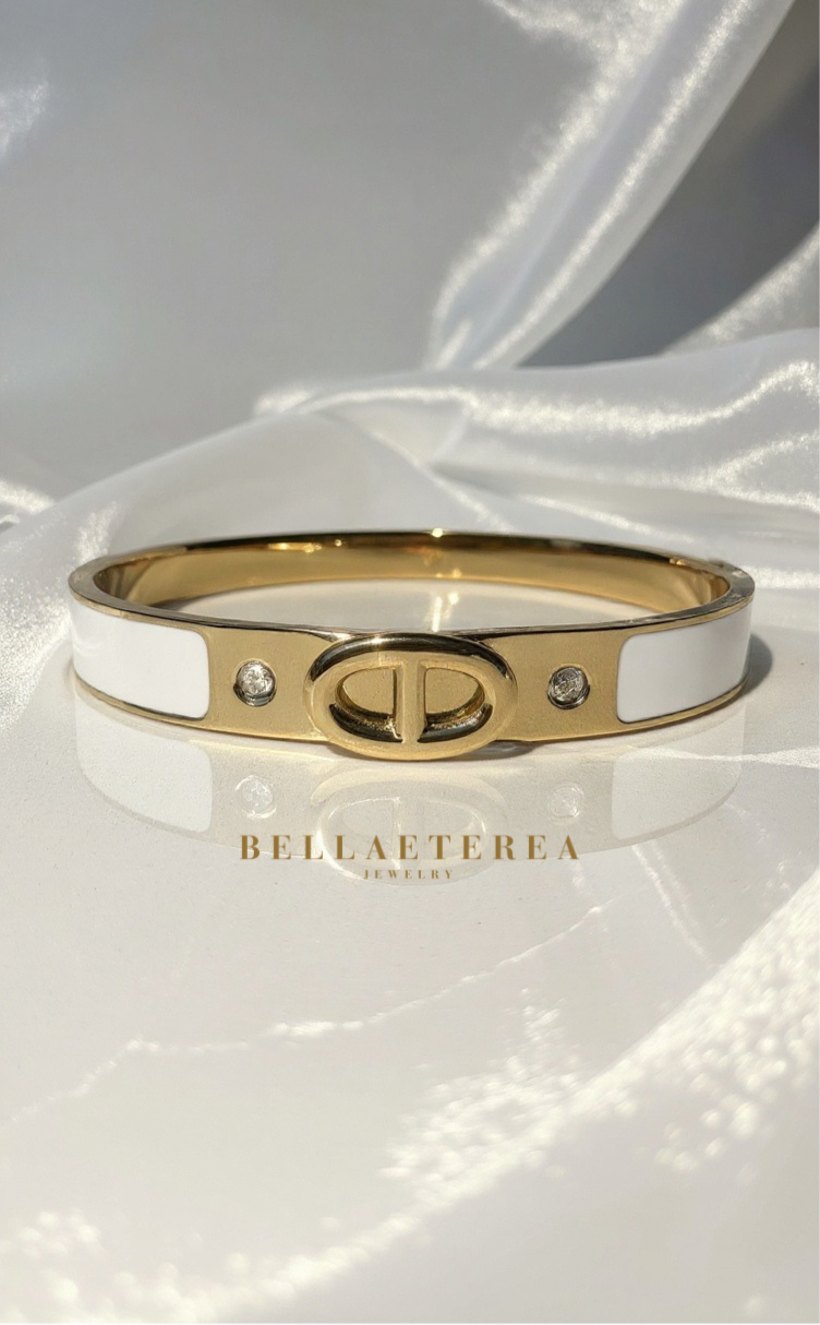 Evelyn is a refined and modern bangle, characterized by a delicate white enamel finish that illuminates the wrist with discretion and style. The central link symbol, embellished with two sparkling zirconia on the sides, adds a precious detail that captures the light with every movement.