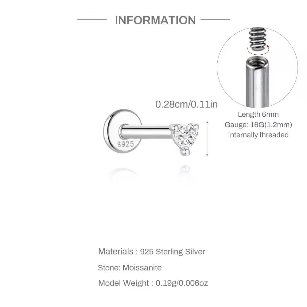 Brilla con il nostro Piercing Heart: un gioiello elegante e versatile con retro piatto avvitabile impreziosito da Moissanite taglio cuore. Realizzato in Argento 925, è completamente privo di nichel e piombo, ideale anche per orecchie sensibili.
