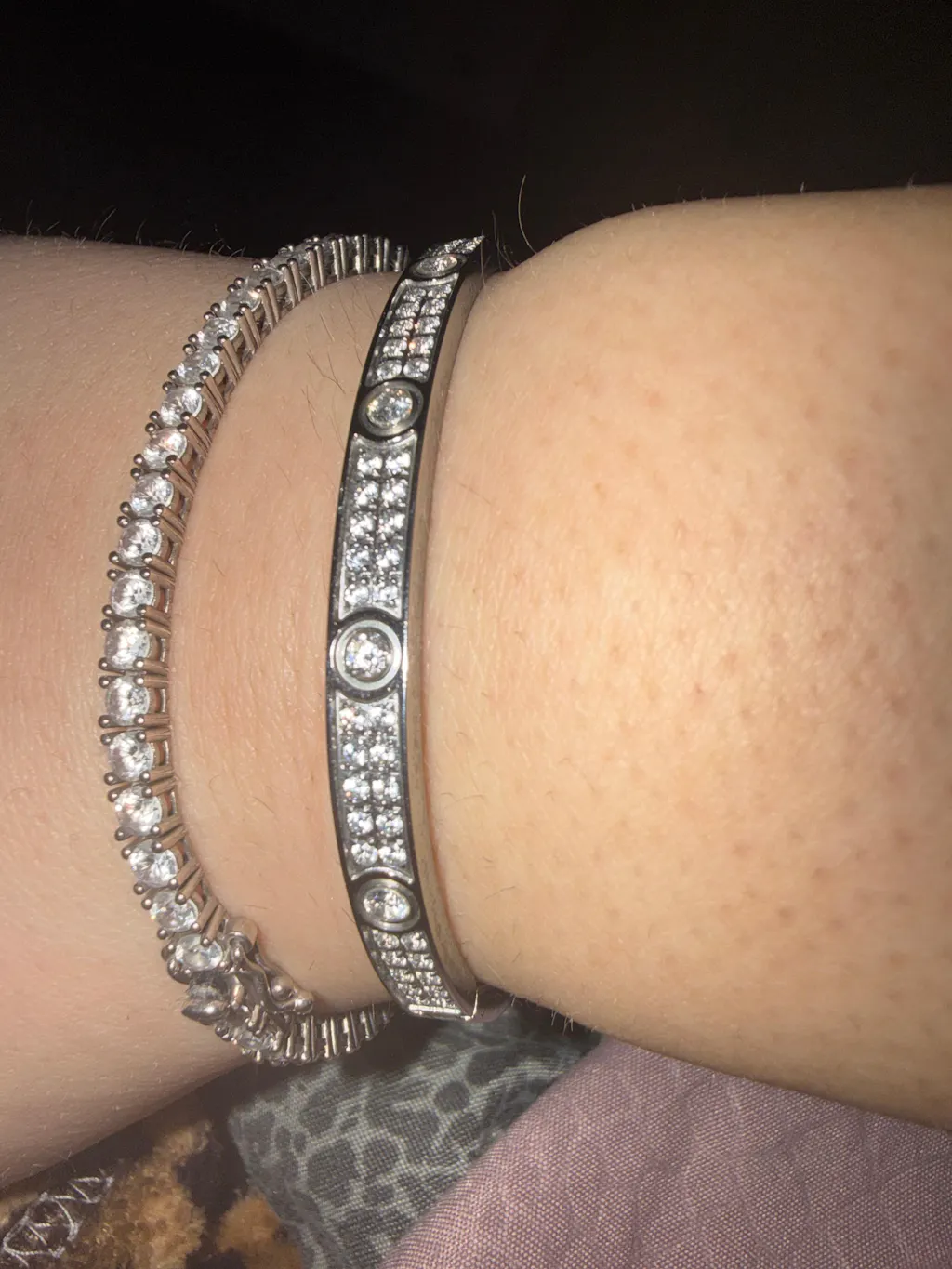 Isadora è un bangle sontuoso e femminile, completamente rivestito da zirconi incastonati con precisione, disposti in orizzontale in una sequenza ritmica e sofisticata. Ogni tratto è impreziosito da zirconi tondi di dimensione maggiore, elegantemente alternati, per creare un gioco di riflessi continuo — sia sul fronte che sul retro del bracciale.