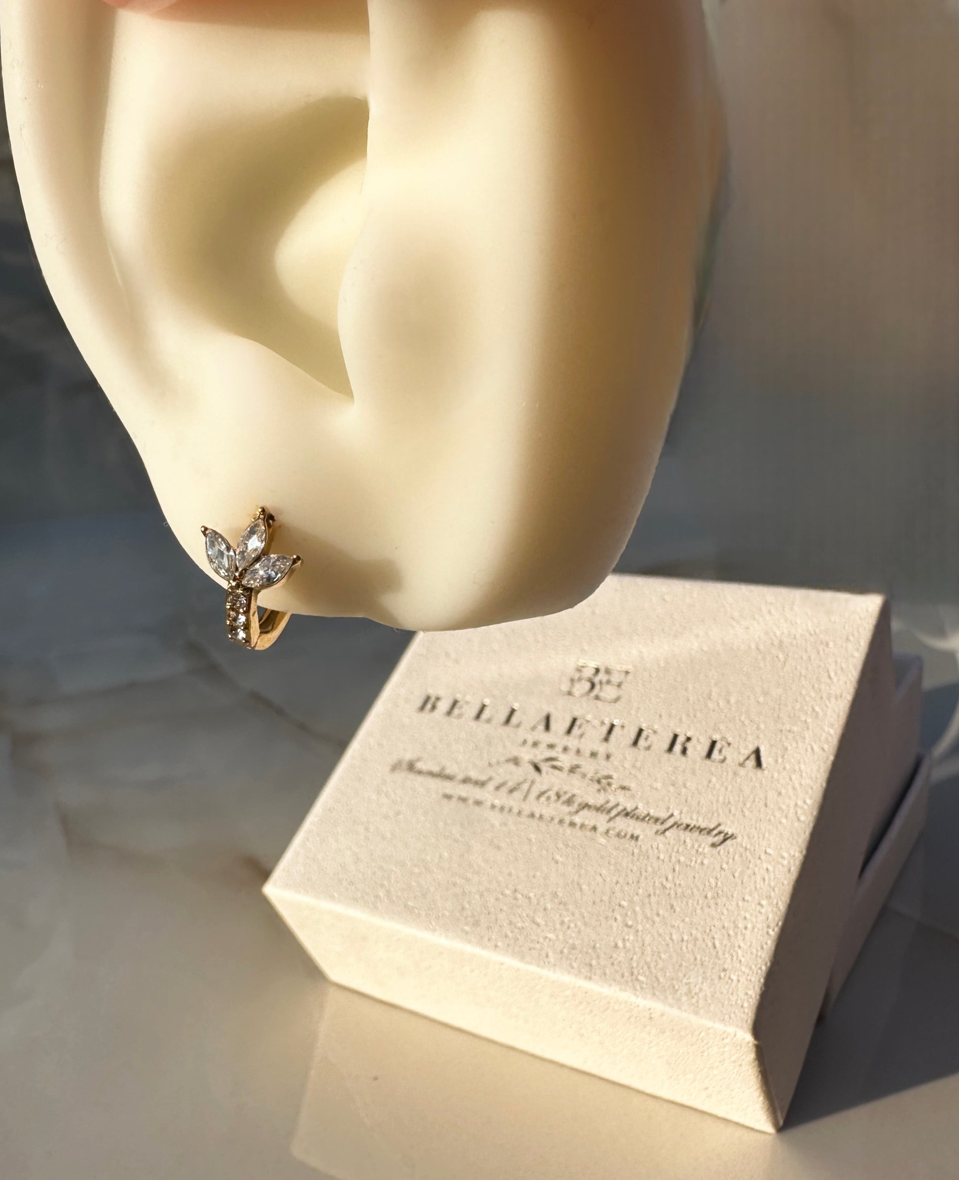 Raffinati e femminili, questi orecchini a cerchietto presentano un fiore a 3 petali al centro, incastonato da pietre marquise, e il cerchio stesso è impreziosito da zirconi cubici che catturano la luce ad ogni movimento.