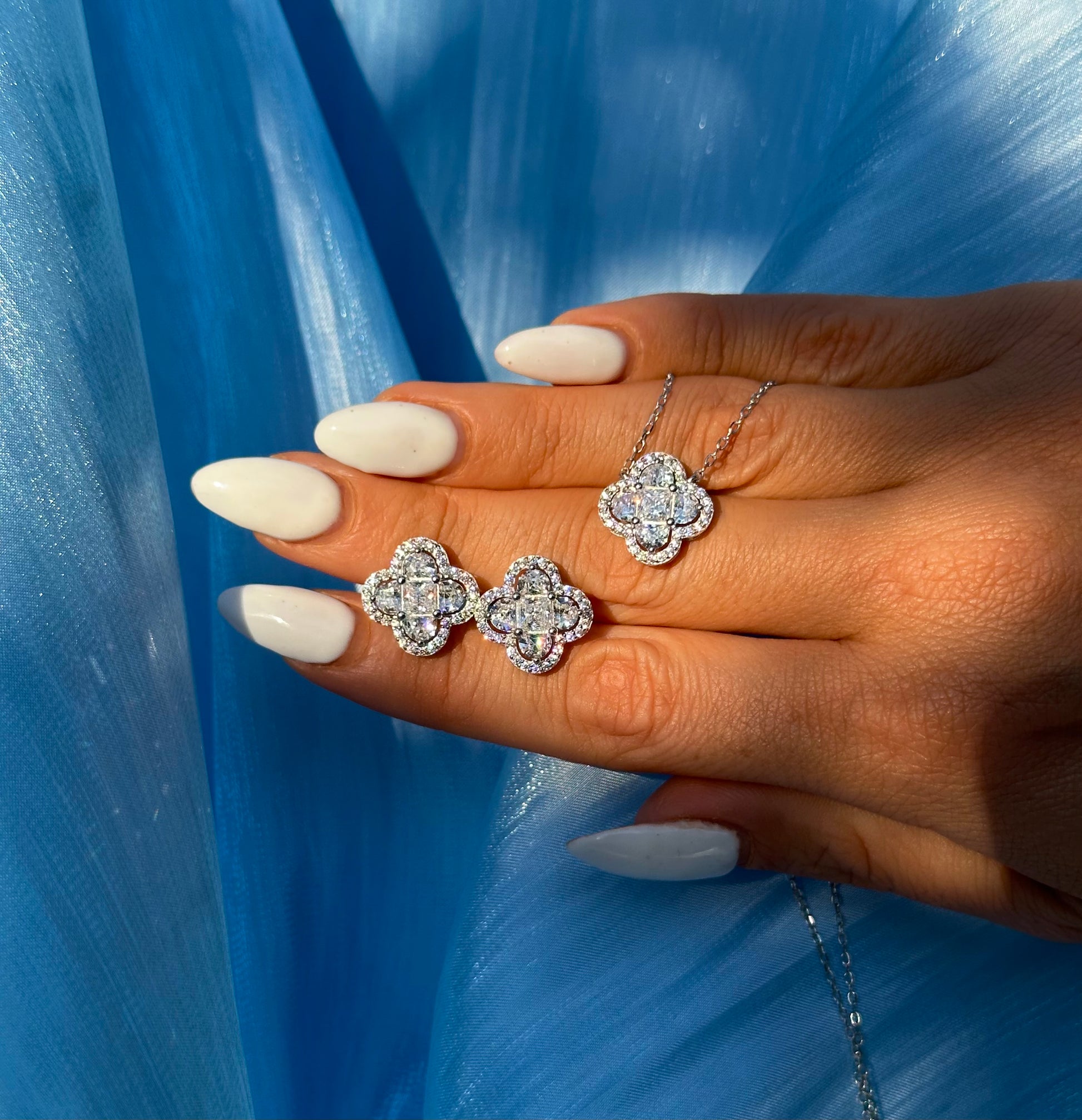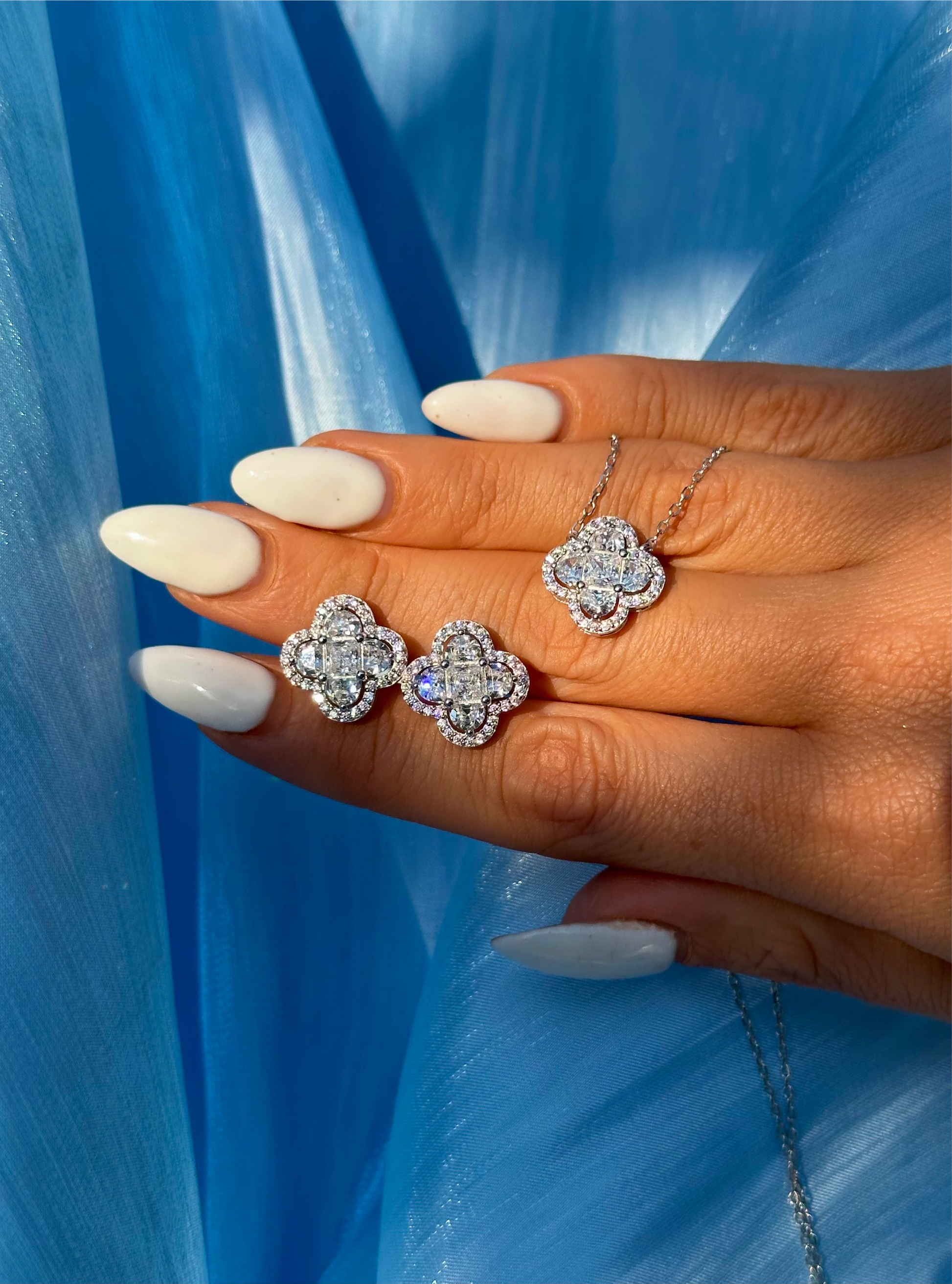 Realizzati con zirconi cubici di altissima qualità, questi orecchini stud riproducono il raffinato quadrifoglio protagonista dell’anello e della collana. Ogni petalo è finemente incastonato e contornato da un delicato effetto halo di micro-pietre che amplifica la brillantezza della pietra centrale, creando un effetto scintillante straordinario.