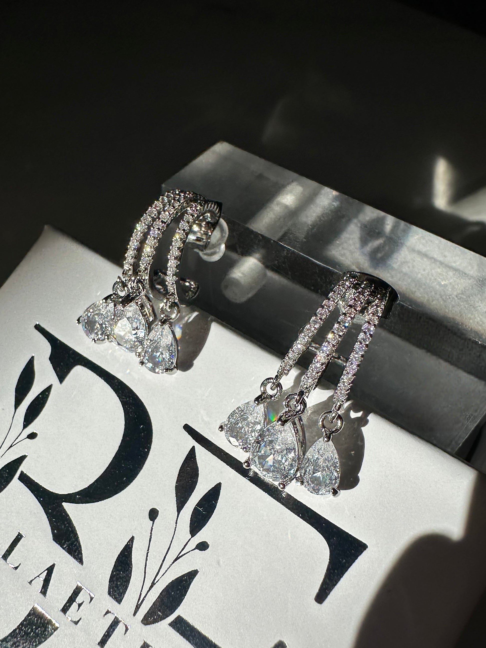 I Pendenti Aurora hanno un design raffinato e dinamico: tre cerchietti sottili, incastonati di zirconi luminosi, sorreggono zirconi pendenti a goccia bianchi. La goccia centrale, più grande e leggermente avanzata, crea un gioco armonioso di profondità e luce.