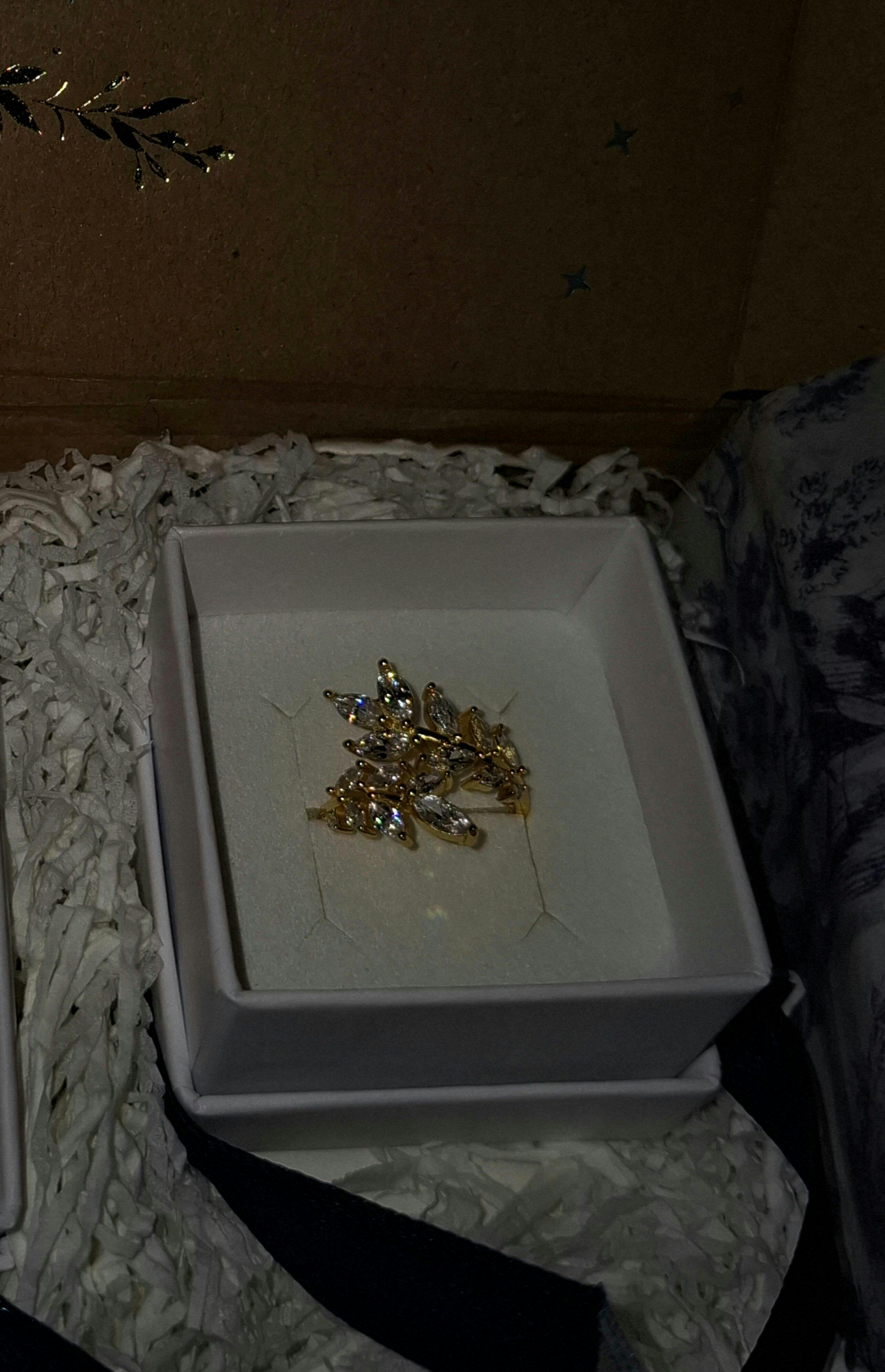 Le foglie, finemente modellate, sono interamente incastonate a mano con zirconi cubici 5A di straordinaria brillantezza, che donano al gioiello una luce vibrante e un’eleganza senza tempo.