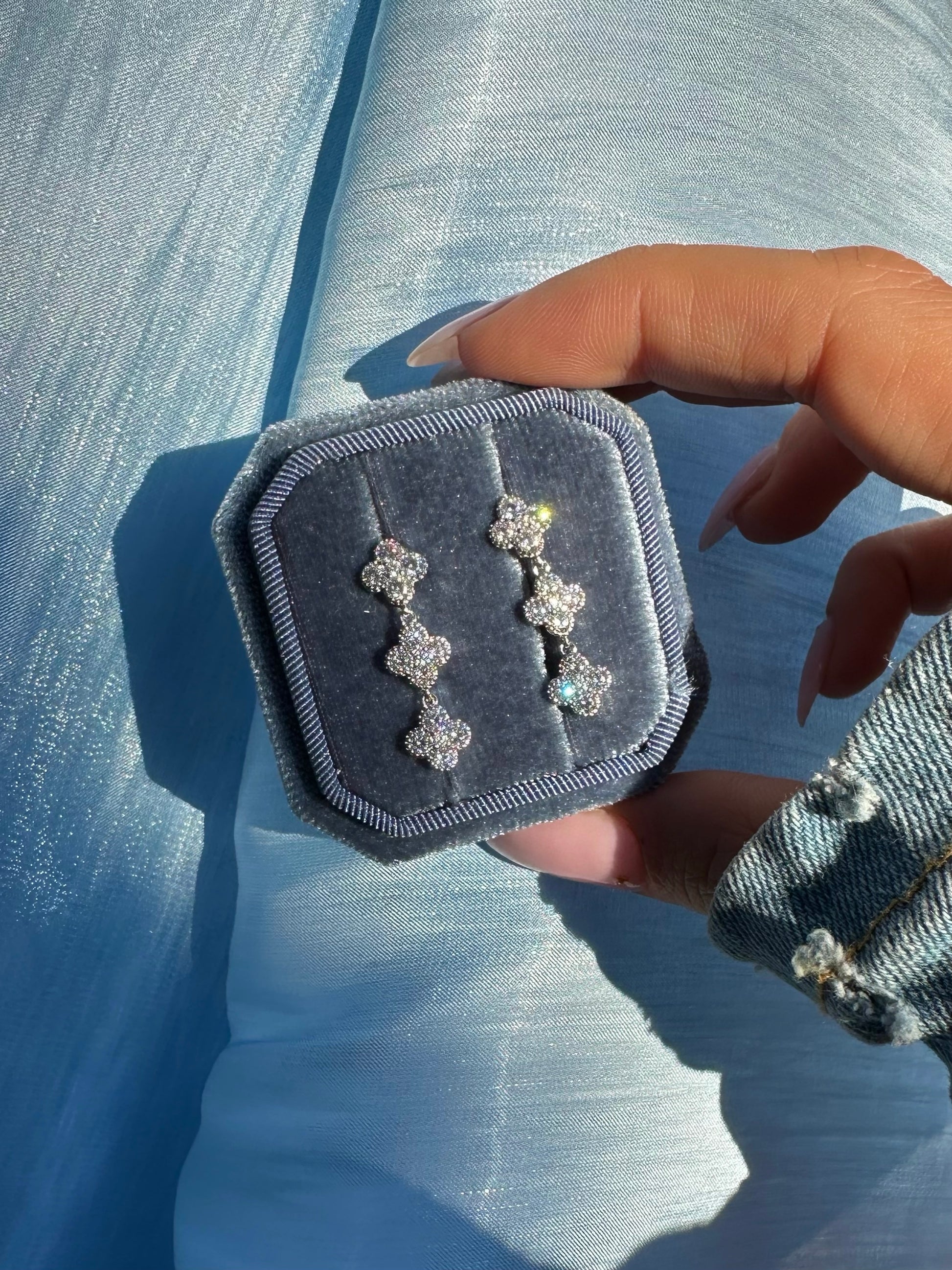 Realizzati in argento 925 placcato rodio, questi orecchini pendenti sono composti da tre fiori stilizzati disposti in verticale, interamente incastonati con zirconi cubici tondi da 2,5 mm di grado 5A, lavorati a mano con maestria.